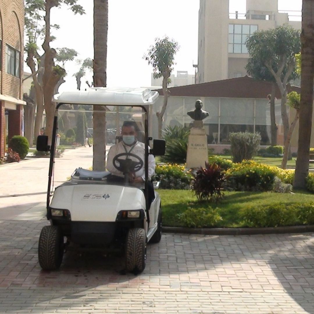 At the Italian Hospital in Cairo, small electric vehicles (golf carts) are used to enhance internal transportation across the hospital campus. These vehicles play a key role in efficiently and safely moving patients, staff, and medical supplies.